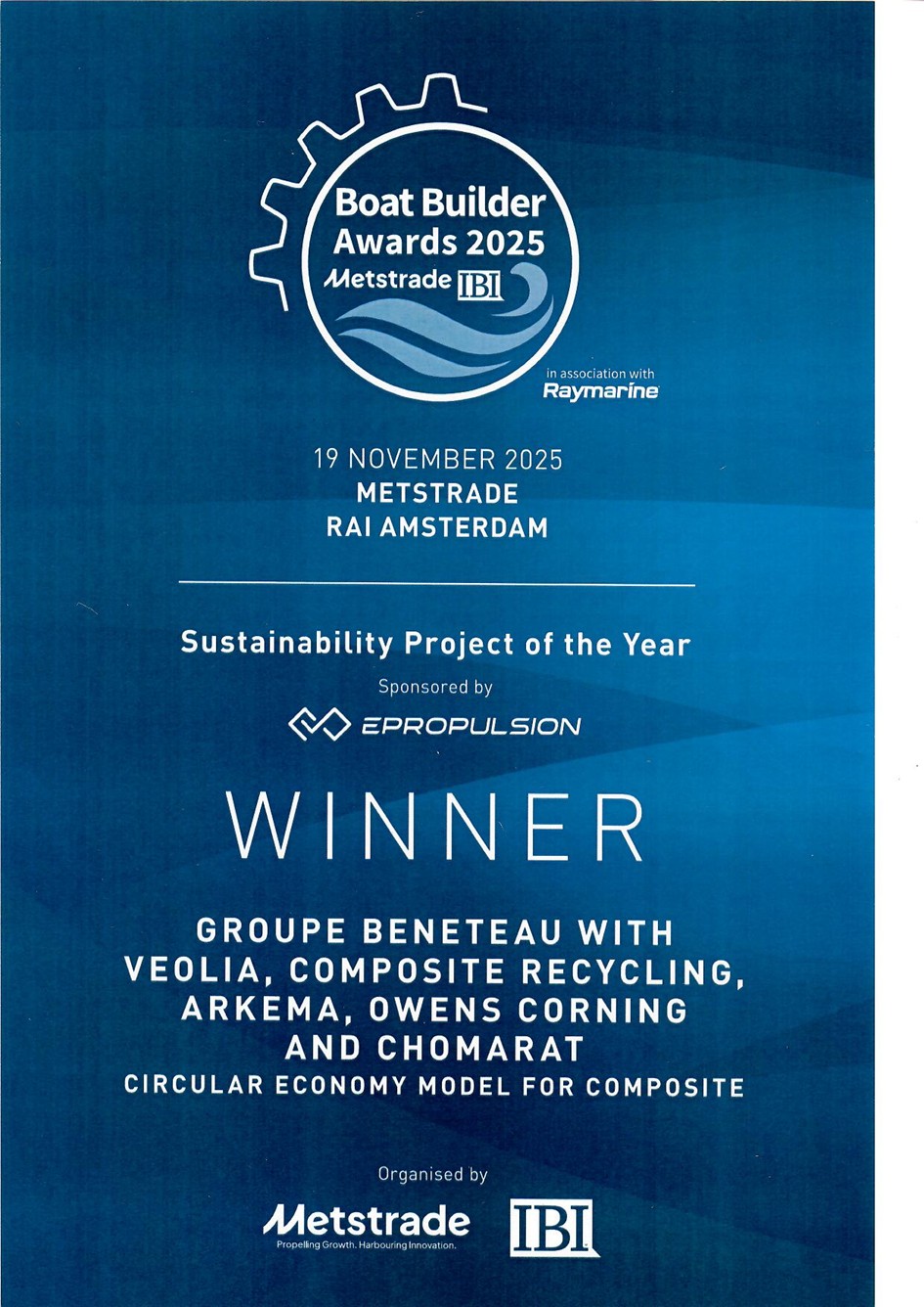 Composite Recycling, a Swiss innovator in composite material recycling, has been recognized at the 2025 Boat Builder Awards, held during the METSTRADE show in Amsterdam. The company, together with its partners Groupe Beneteau, Veolia, Arkema, Owens Corning and Chomarat, received the award for the Sustainability Project of the Year, a category that celebrates initiatives driving sustainability in the marine industry.